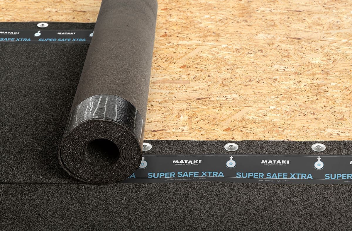 Mataki Super Safe Xtra er et eksempel på et overlagsbelegg som er velegnet for tekking på alle typer nye skråtak, eller omtekking av gamle papptak ned til tre graders fall (1:18).