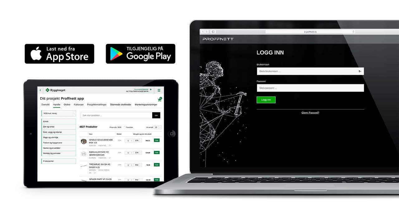 Med Proffnett får du full tilgang til å se dine avtalepriser hos Byggtorget og aktive prosjekter hele døgnet, uansett hvor du befinner deg. I tillegg til å handle varer er det enkelt å sette opp egne prosjekter, lage og sende tilbud, lage materialister og hente ut dokumentasjon per prosjekt. Proffnett lar deg også enkelt generere samledokument av FDV og monteringsanvisninger.