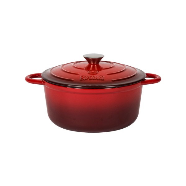 Stor rødemaljert gryte med lokk. Gryta er av svært høy kvalitet og fordeler varmen jevnt for et optimalt resultat. Kan brukes over alle varmekilder, inkludert bål og induksjon. Ø 28 cm