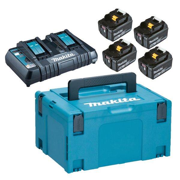 Batterisett. 4stk 18V 5.0Ah batterier og DC18RD dobbellader leverert i Makpac systainer. Brukes med alle LXT 18V og 2x18 maskiner fra Makita. Batterisettet er ypperlig for deg som har 2x18V maskiner og for deg som har flere ordinære 18V maskiner. 5.0Ah batterier lades på 45 minutter i DC18RD laderen (lader et batteri av gangen).