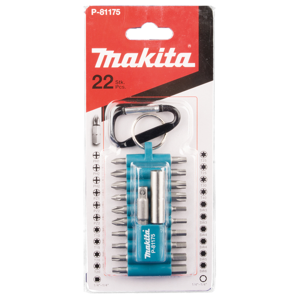 Bitssett i praktisk belteklips. Settet inneholder TX, PH, PZ og hexagon bits. I tillegg en magnetisk forlenger og 1/4" adapter.
