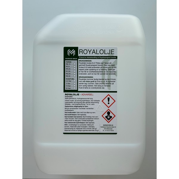 Vedlikeholdsolje til Royalbehandlet produkter fra Marnar Bruk. Brukes også til å behandle kappflater.